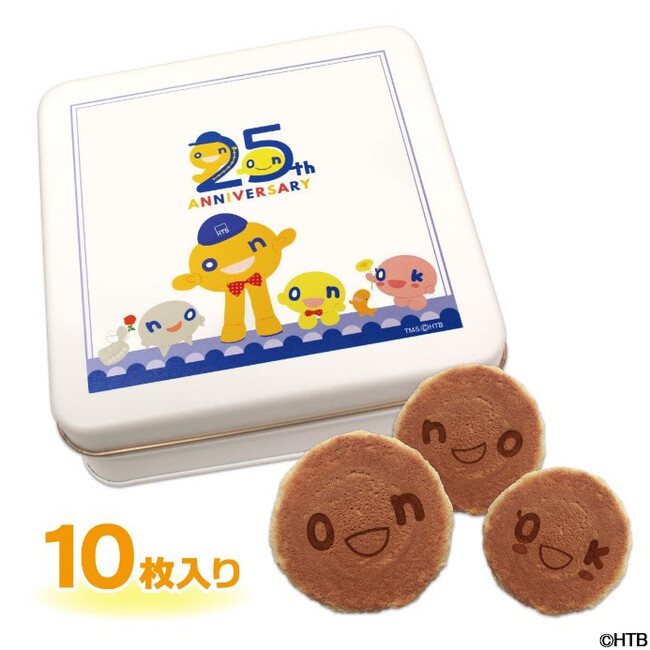 「25周年アニバーサリー缶入りバターせんべい」は現在HTB本社、HTBコーナーで限定販売されているonちゃんの顔のバターせんべいに加え、25周年記念の特別バージョンとして、okちゃんバージョン、noちゃんバージョンも作成した10枚詰合せ。缶を開けた瞬間にバターのあまい香りが広がります。