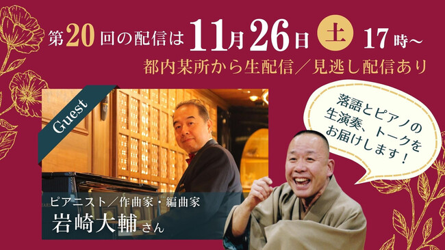 毎日新聞社は11月26日(土)午後5時から、第20回オンライン落語会「志ん輔と仲間たち」をインターネットでライブ配信します。演目は「疝気(せんき)の虫」と「文七元結(もっとい)」。ゲストは福岡市を拠点に活動するピアニストの岩崎大輔さんです。