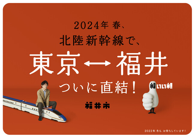 ポスターの内容は、2024年春の北陸新幹線の福井開業で東京と福井が直結となることや「越前がに」の魅力を福いいネ!くんがメッセージを添えてPR。