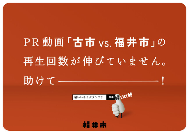 また、現在WEBで公開中のPR動画「古市vs.福井市」の再生回数が期待通りに伸びていないことを悲しむ福いいネ!くんが素直に動画視聴をお願いしています。「助けてーーーーーーーーーーー!」