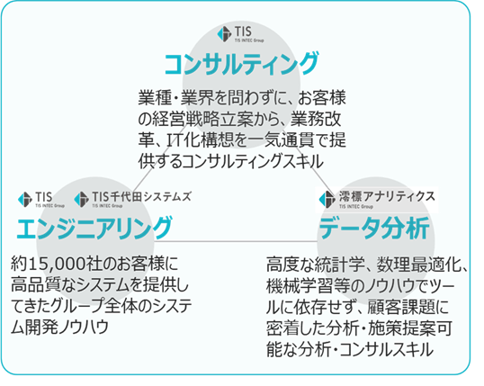 TISのコンサルティング力と、グループ会社であるTIS千代田システムズのシステム開発力と、澪標のデータ分析/AIの力を掛け合わせることで、従来のデータコンサルティングにはない「上流から下流まで一気通貫での製造DX」を実現します。