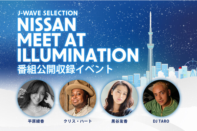 ラジオ局J-WAVE(81.3FM)では、DJ TAROがナビゲート、平原綾香、クリス・ハート、黒谷友香が出演する特別番組『J-WAVE SELECTION NISSAN MEET AT ILLUMINATION』の公開収録を、12月3日(土)に東京スカイツリータウン(R)にて実施いたします。