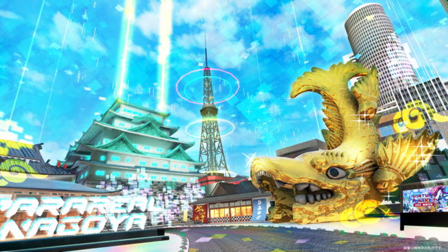 「パラリアル名古屋会場」では、名古屋のシンボル名古屋城や、現在ではリアルでは見ることのできなくなってしまった飛翔のオブジェを復刻させ設置し、久屋大通を再現した通りに企業ブースが軒を連ねます。最終地点にはJR名古屋駅を再現したバーチャル名古屋駅へ繋がります。