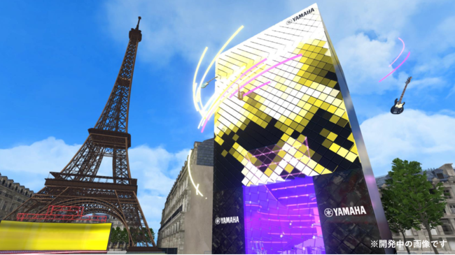 「パラリアルパリ」のエッフェル塔を臨むロケーションに、ヤマハ銀座店をモチーフにしたブースを構えます。きらめく楽器が建物の周囲や頭上を踊るように飛び回ったり、ガラス張りの入り口が回転してお客様を出迎えたりするなど、VRならではの心躍る演出を盛り込んでいます。