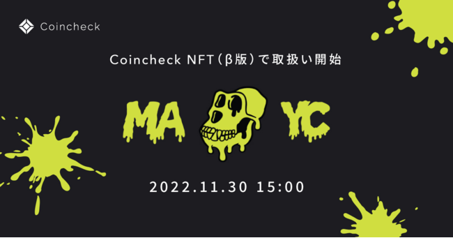 コインチェック株式会社(本社:東京都渋谷区、代表取締役:蓮尾 聡、以下、当社)は、2022年11月30日より、NFTマーケットプレイスCoincheck NFT(β版)において、新たに「Mutant Ape Yacht Club(ミュータント・エイプ・ヨット・クラブ、以下MAYC)」の取扱いを開始いたします。