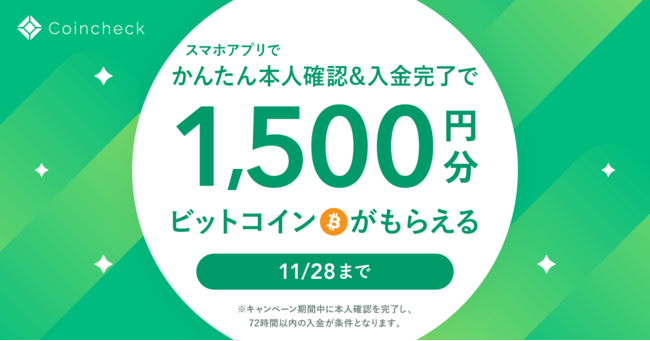 Coincheckでは2022年11月21日より、本人確認(口座開設)完了後に日本円入金を行った方全員に1,500円相当のビットコイン(BTC)をプレゼントする「ビットコインあげちゃうキャンペーン」を開催します。