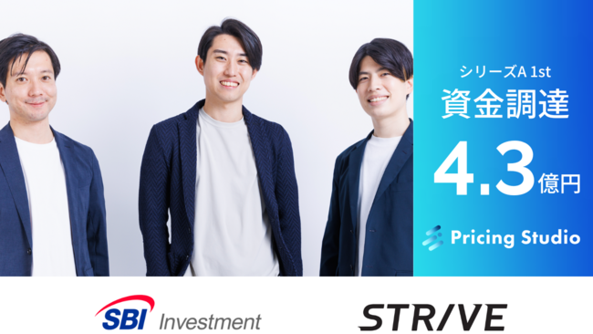 プライシング・価格戦略に対するコンサルティング事業を手がける、プライシングスタジオ株式会社(本社:東京都港区、代表取締役:高橋嘉尋、以下「プライシングスタジオ」)は、シリーズAラウンド・1stクローズとして、SBIインベストメントをリードインベスターとし、既存投資家のSTRIVE、新規で複数の個人投資家を引受先とした第三者割当増資及び、大手金融機関からのデットファイナンスを合わせ、4.3億円の資金調達を実施しました。なお、今冬には2ndクローズでの追加調達を予定しています。