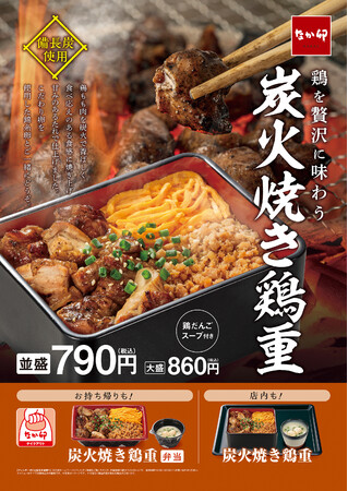 【なか卯】なか卯に鶏三昧の「炭火焼き鶏重」新登場!~炭火焼き、そぼろ、鶏だんごスープで味わう鶏の旨み~