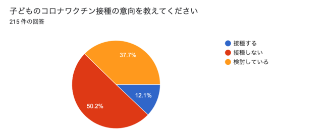 0歳~10歳以上の子どもがいる方を対象に調査した結果、全体の約5割が「接種しない(50.2%)」と回答し、約4割が「検討する」、残り1割が「接種する」と回答しました。