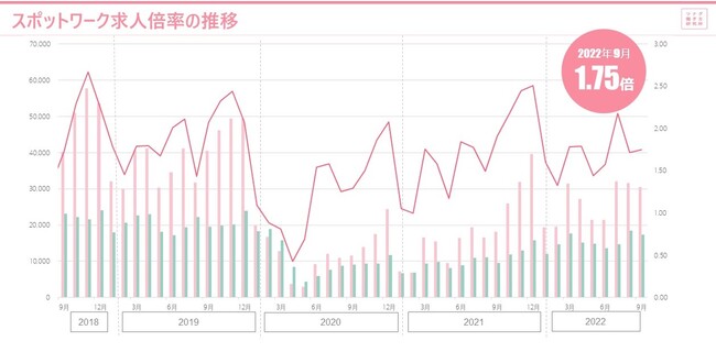 1.単発、短時間、短期間で働くスポットワークの2022年9月度求人倍率は1.75倍
