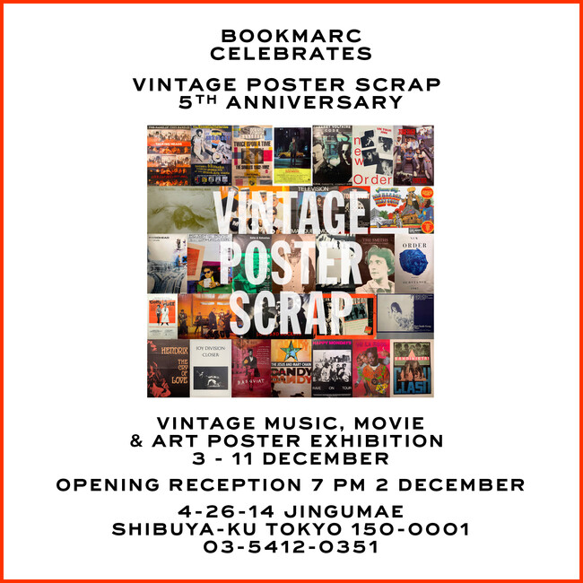 ニューヨーク発ファッションブランド「マーク ジェイコブス」が手掛けるブックストア「BOOKMARC(ブックマーク)」にて、音楽プロデューサー/アーティストの井出靖氏が収集してきたレア・ヴィンテージ・ポスターの展示販売を行います。井出氏のポスターコレクション約500枚を収めた「VINTAGE POSTER SCRAP」は、2017年発売以降、日本のみならず欧州と北米でもロング・セラーを続けている話題の書籍です。今回はその5周年となる待望のポスター展となります。前日の夜12/2(金)にプレビューを開催。ゲストDJに高木完氏を迎えたオープニング・レセプションとなります。皆様のご来店をお待ちしております。