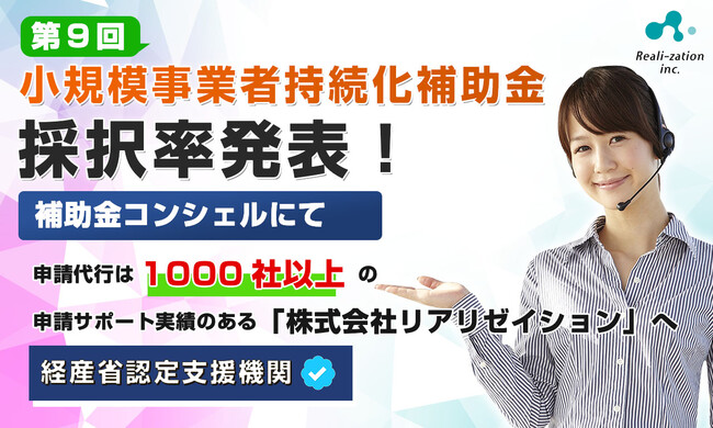 「世界一優しい行政手続きに」をキャッチコピーとする、株式会社リアリゼイション(本社:東京都渋谷区)は、令和元年度補正予算・令和3年度補正予算「小規模事業者持続化補助金」の歴代採択率及び、第9回の採択率を調査、発表しました。