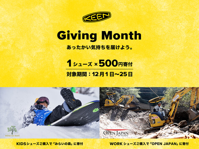 2003年の創業以来、社会貢献を経営の礎とするアウトドア・フットウェアブランド『KEEN(キーン)』(キーン・ジャパン合同会社 東京都港区)は、今年も、Giving Tuesday(ギビング・チューズデー)である2022年11月29日から、12月25日までの約1か月間を<KEENのGiving Month(ギビング・マンス)>とし “あったかい気持ち” を、災害や紛争、社会的な課題から困難な状況にある人びと、そして子どもたちへ届けます。12月1~25日には、対象商品(キッズシューズおよび、ワークシューズ)をKEEN直営店、KEEN公式オンラインストア、新宿高島屋KEEN SHOP(ショップ イン ショップ)にて1足ご購入いただくごとに、500円を寄付させていただくキャンペーンを実施いたします。寄付先となるのは、児童養護施設に暮らす子どもたちの成長をアウトドア体験を通じてサポートするNPO「みらいの森」と、被災された方々を支える災害支援団体「OPEN JAPAN」の2団体。私たちと一緒に、“あったかい気持ち” を届けませんか?