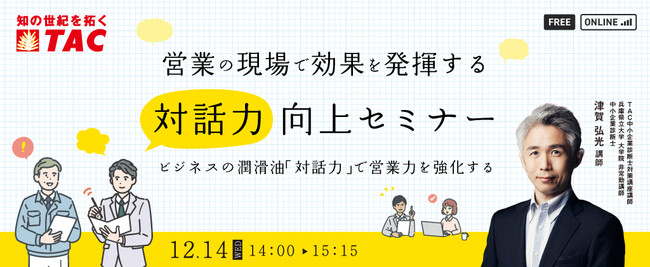 公認会計士や税理士など、多くの国家資格や検定試験の受験指導などの教育事業を展開しているTAC株式会社(東京都千代田区、代表取締役:多田敏男)は、法人向け人材教育部門から、「傾聴力」を高めクライアント寄り添える営業になるための現場で効果を発揮する対話力セミナーを2022年12月14日(水)に実施します。