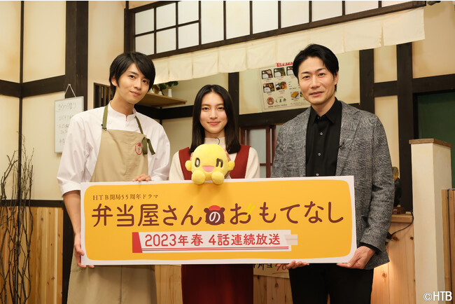 札幌の路地裏に佇む弁当屋「くま弁」を舞台に繰り広げられる、ハートウォーミングなグルメドラマ『弁当屋さんのおもてなし』。HTB開局55周年の記念となる作品に、札幌出身の3人が主要キャストとして出演することが決まり、11月24日に会見が開かれました。