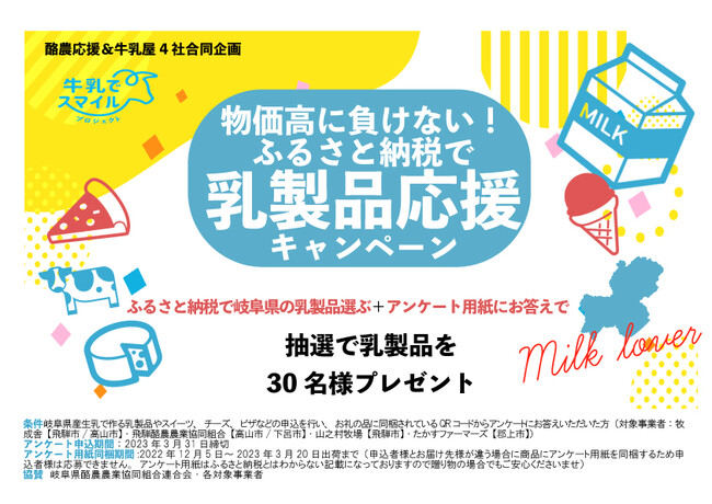 岐阜県の乳業メーカー4社のいずれかのふるさと納税を行い、お礼の品に同梱するアンケート用紙からQRコードを読み取り申し込みをされた方の中から、抽選で30名様に岐阜県の乳製品をプレゼントいたします。