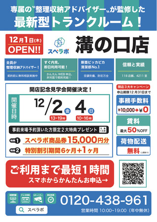 【12月1日(木)オープン】見学から契約、解約まで完全非接触・非対面、お申し込みからご利用まで最短1時間!都内、大阪などにて絶賛運営中のトランクルーム【スペラボ】が溝の口駅近くに出店!