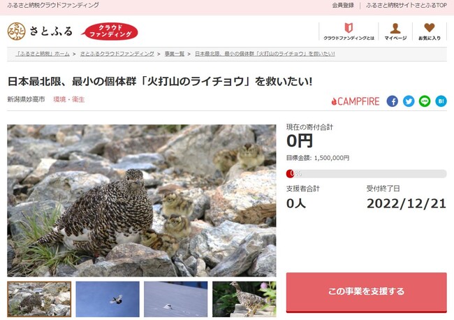新潟県妙高市とふるさと納税ポータルサイト「さとふる」(https://www.satofull.jp/)を運営する株式会社さとふる(本社:東京都中央区、代表取締役社長:藤井 宏明)は、寄付金の使途に応じて事業を立ち上げ寄付を募る「さとふるクラウドファンディング」(https://www.satofull.jp/projects/top.php)にて、妙高市の火打山に生息する絶滅危惧種のニホンライチョウの調査保護活動を行うため、2022年11月30日(水)より寄付受け付けを開始します。