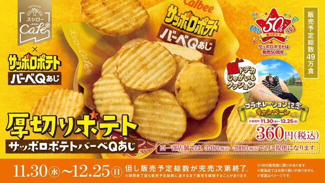 株式会社あきんどスシロー(本社:大阪府吹田市、代表取締役社長:新居 耕平)は、カルビー株式会社(本社:東京都千代田区、代表取締役社長:伊藤 秀二)とコラボレーションし、今年50周年を迎えた「サッポロポテト」ブランドの「バーベQあじ」の味に仕立てた「厚切りポテトサッポロポテトバーベQあじ」を、11月30日(水)より全国のスシローにて期間限定で販売いたします。