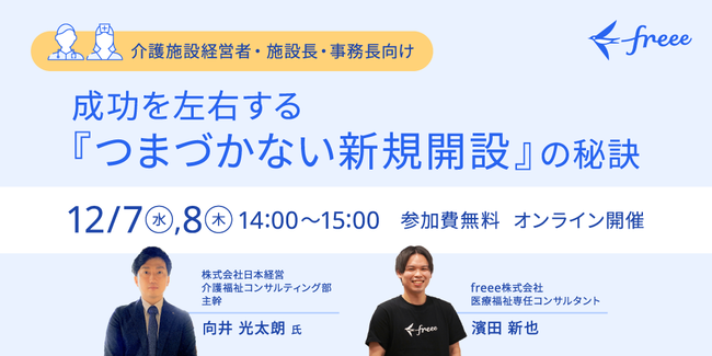 freee株式会社(本社:東京都品川区、CEO:佐々木大輔、以下「freee」)はfreee人事労務の「医療福祉向け導入支援パッケージ」の提供開始に伴い、12月7日・8日に「成功を左右する『つまづかない新規開設』の秘訣」をオンラインにて開催します。