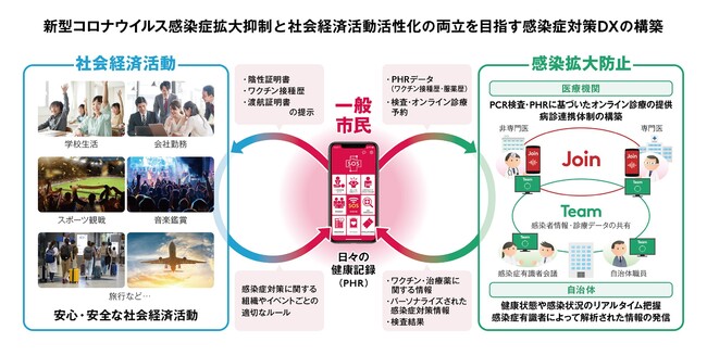 1. 医療提供体制の強化:発熱や咳などの症状があり新型コロナウイルス感染症が疑われる方に向けてPHR(Personal Health Record)に基づいたオンライン診療を提供する。専門医と非専門医をJoinで繋ぎ、診療相談ができる病診連携体制を構築する。