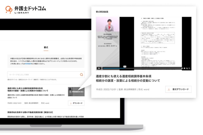 弁護士ドットコム株式会社(東京都港区、代表取締役社長:元榮 太一郎、以下当社)は、弁護士が法律書籍・雑誌を閲覧できるサブスクリプションサービス「弁護士ドットコムLIBRARY」に、書面作成を簡易にする協議書や和解文書等の書式100点と解説動画の提供を開始したことをお知らせします。