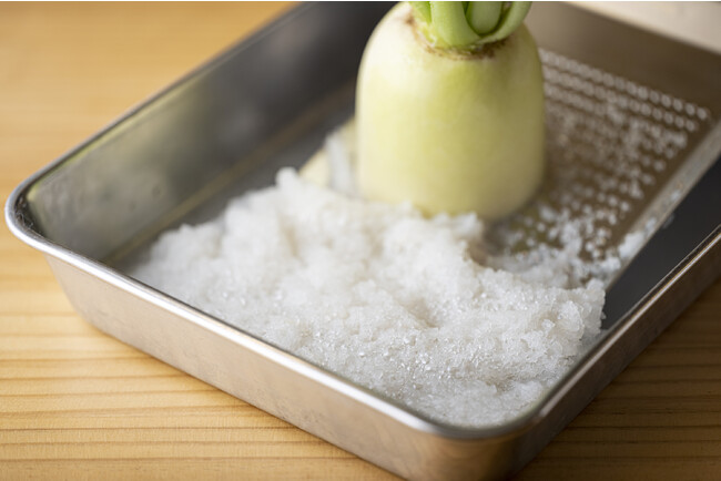 食材を最大限活かす目立てで、水分量を多く含み、淡雪のようにフワフワでありながら素材の食感も残す、紀州新家おろし金だけが生み出すことのできる『フワフワ・ザクザク』の新食感のおろしを味わって頂けます。