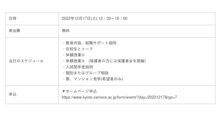 京都ホテル観光ブライダル専門学校は2022年12月17日(土)にオープンキャンパスXmasスペシャルを開催します。今回のオープンキャンパスは、当日限定の特別授業を開催し、ホテル・旅行・観光・ブライダル分野の職業体験の授業が2つ受けられるスペシャルバージョンです。