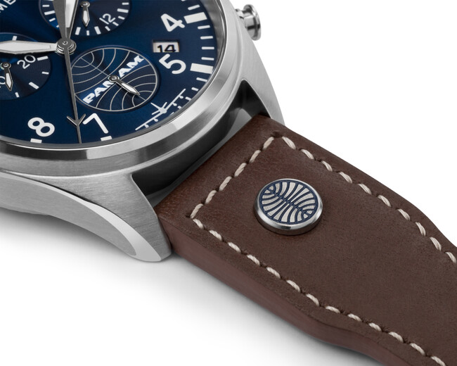 パンナム航空の グローブロゴが文字盤、ケース裏、リューズ、レザーストラップに配され、パッケージにはコーポレートカラーであるブルーを基調に、レトロなステッカー風のデザインを採用。このほか、特典としてパンナム航空の頭文字を象った”PAA”のピンバッジが付属します。