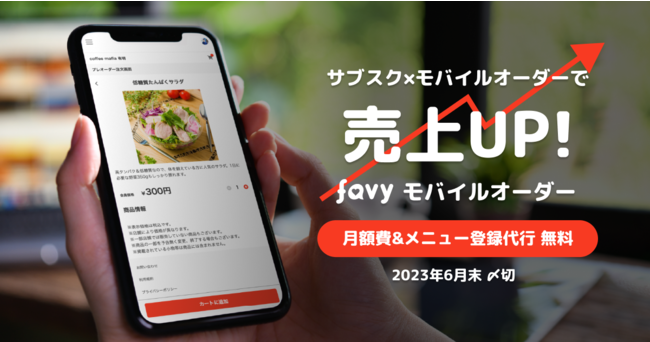 株式会社favy(代表取締役社長:高梨 巧、本社:東京都新宿区、以下favy)は、本日2022年12月1日から2023年6月末まで、favyサブスクご利用店舗さま向けに、favyモバイルオーダー機能を月額無料でご利用いただけるキャンペーンを実施いたします。モバイルオーダー内のメニュー登録の代行も無料で承ります。ぜひこの機会にご利用ください。