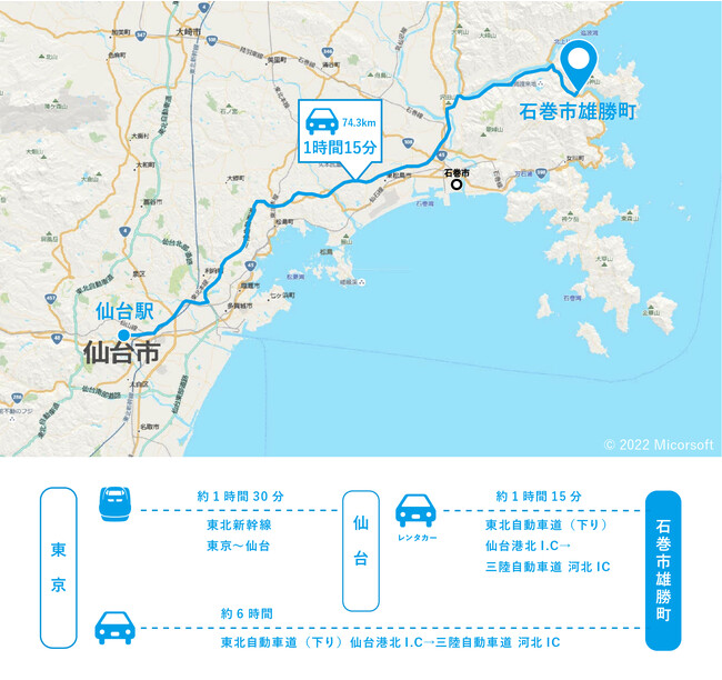 JR仙台駅から車で1時間15分 / JR仙石線石巻駅から車で40分
