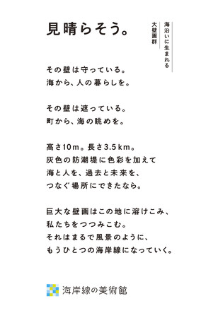「海岸線の美術館」は、2011年に発生した東日本大震災後に雄勝町の海岸線を囲うように建設された、高さ最大10m、全長約3.5kmの巨大な防潮堤に壁画を描いていくアートプロジェクトです。人の暮らしを津波から守る壁でありながら、同時に美しい海の景色を遮る壁にもなっている灰色の防潮堤に絵を描くことで、海沿いに新しい風景を生みだし、海と人を、過去と未来をつなぐ場所に変えていくことを目指しています。