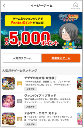 従来の簡単ゆるゲーム(広告型ゲーム)約200タイトルに加えて、人気ガチゲーム「ゲソてん byGMO」の「ゲゲゲの鬼太郎 ~妖怪横丁~」や「城姫クエスト 極」などの人気のフリーミアム※型ゲーム約50タイトルも提供し、今後もタイトル数を充実させていくことで、より多様なニーズへ対応が可能になります。また、「イージーゲーム」内の決済などで獲得したPontaポイントは、ゲーム内の課金のほか、ほかのサービスや日常の店舗などで利用できます。