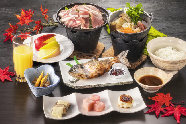 ジューシーで柔らかい八幡平ポークと比内地鶏のだしが効いたきりたんぽ鍋に、おいしい青森りんごやいぶりがっこなどもついた多彩な味を楽しめるお膳です。