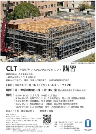 国立大学法人岡山大学(本部:岡山市北区、学長:槇野博史)のグリーンイノベーションセンターは、2022年11月16日、一般社団法人日本CLT協会と共催で「CLTを学びたい人のリカレント講習」を開催しました。