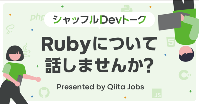 株式会社エイチームのグループ会社であるQiita株式会社(本社:名古屋市中村区、代表取締役社長:柴田健介、以下当社)が運営する「Qiita Jobs」は、同じ職種や同じ技術に関心があるエンジニア同士で知識共有や意見交換や交流ができる「Devトーク」の特別企画として「シャッフルDevトーク」を初開催します。初回開催はプログラミング言語であるRubyをテーマに、Rubyを利用した開発をメインに行っている方やご興味がある方を対象に実施いたします。