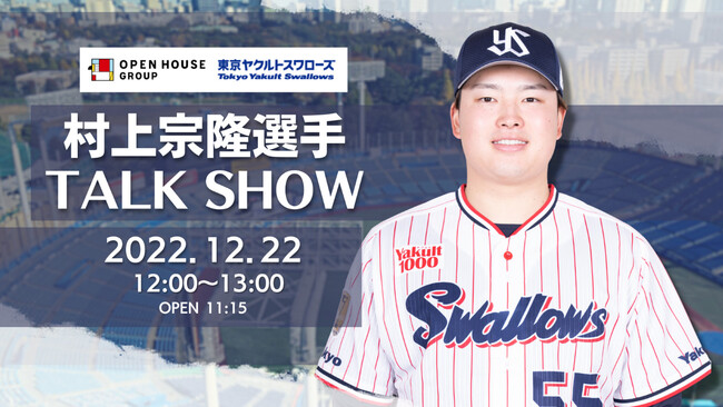 株式会社オープンハウスグループ(本社 東京都千代田区、代表取締役社長 荒井正昭、以下「当社」)は、東京ヤクルトスワローズ(以下「スワローズ」)のトップスポンサーとして、2022年12月22日(木)に村上宗隆選手をお招きしたトークショーを開催するにあたり、本日17時より観覧募集を開始いたします。抽選でスワローズファンの方を100名ご招待いたします。スワローズのセ・リーグ優勝、そして村上選手の56号ホームラン・三冠王の大記録の喜びを分かち合いましょう。