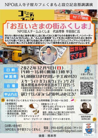 NPO法人チームふくしま(福島県福島市 理事長:半田真仁)は、12月4日(日)14時より熊本県熊本市内にて開催される「NPO法人寺子屋カフェくまもと」設立記念イベント内で、「お互いさまの街 ふくしま」について基調講演することをお知らせいたします。