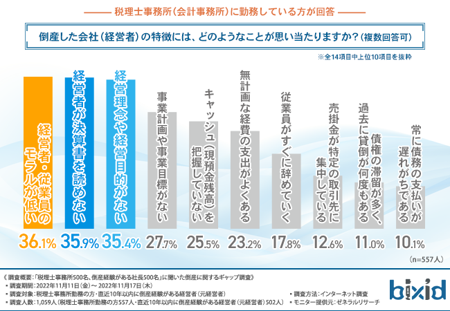 「倒産した会社(経営者)の特徴には、どのようなことが思い当たりますか?(複数回答可)」と質問したところ、『経営者・従業員のモラルが低い(36.1%)』と回答した方が最も多く、次いで『経営者が決算書を読めない(35.9%)』『経営理念や経営目的がない(35.4%)』『事業計画や事業目標がない(27.7%)』『キャッシュ(現預金残高)を把握していない(25.5%)』『無計画な経費の支出がよくある(23.2%)』『従業員がすぐに辞めていく(17.8%)』と続きました。