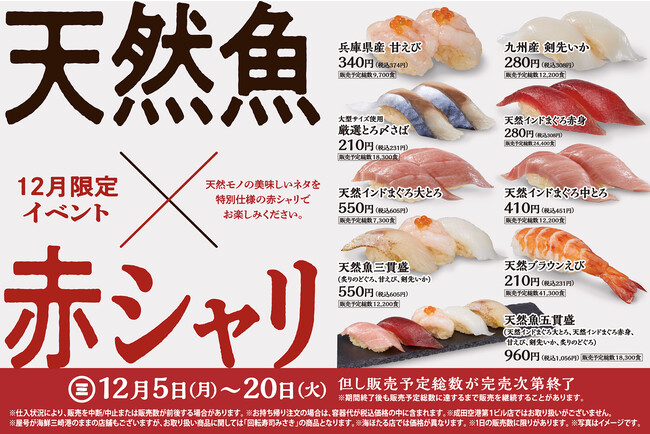 株式会社 京樽(本社:東京都中央区、代表取締役社長:堀江 陽)が展開する「回転寿司みさき(旧:海鮮三崎港)」では、12月5日(月)より12月限定イベントとして『天然魚×赤シャリフェア』を開催いたします。