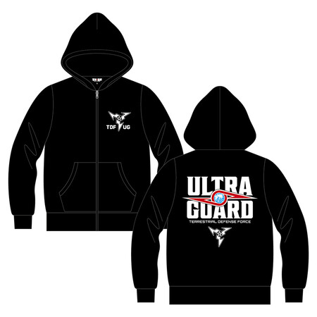 ウルトラ警備隊のジップアップパーカーが登場!! 背面に輝くマークとロゴがシンプルな黒地に絶妙に映える一着。これを切ればウルトラ警備隊気分になれる事請け合いだ!