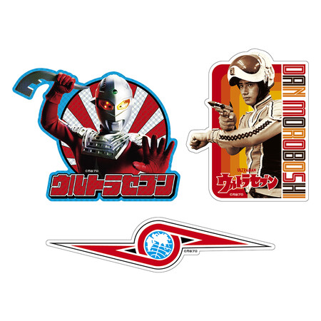 ウルトラセブン、モロボシ・ダン、ウルトラ警備隊マークのお得な3枚セット。セブンがアイスラッガーを構えているのも見逃せないポイントだ。