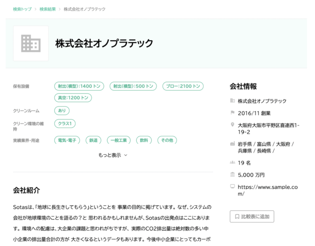 Sotas DBは、資本金や所在地などの企業情報だけではなく、保有設備、クリーンルームの有無、実績業界・用途、取扱実績樹脂、金型調達、加工対応、各種フィラー入りの対応、など詳細情報を網羅し、情報を一箇所に集約。化学商社にとってピンポイントで探したい企業を見つけることができ、各社の比較検討表が簡単に作成できる情報データベースです。