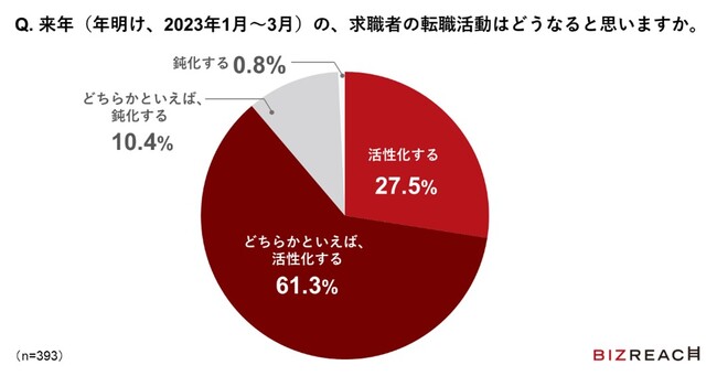 また、来年(年明け、2023年1月~3月)の求職者の転職活動については、「活性化する」と回答したヘッドハンターは88.8%となり、転職市場は企業側・求職者側ともに活性化することが予測されます。