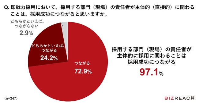 また、即戦力採用において、採用する部門(現場)の責任者が主体的に関わることが採用成功につながると思うと回答したヘッドハンターは97.1%となり、即戦力採用の難度が高まるなか、採用する部門(現場)の責任者が自ら率先して採用活動に関わることが重要になってきていることが分かります。