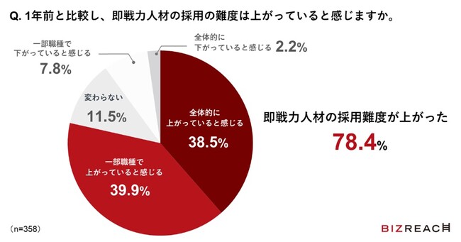 半年前と比較した現在の企業の中途採用活動の状況をたずねたところ、32.7%のヘッドハンターが「活発になった」と回答しました。「変わらず、活発である」を含めると、95.0%のヘッドハンターが企業の中途採用活動が活発だと感じていることが分かりました。また78.4%のヘッドハンターが、1年前と比較して即戦力人材の採用難度が上がっていると回答し、そのうち約半数が全体的に採用難度が上がっていると感じていることが分かりました。多くの企業が活発に中途採用活動を行っているなか、即戦力人材の採用難度が上昇していることが分かります。