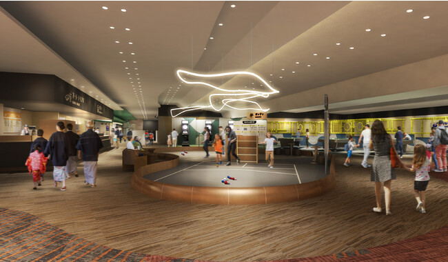 世代を問わずみんなが楽しめるように、近年注目が高まるユニバーサルスポーツとして「ボッチャ」が新たに登場します。また、温泉地の定番「卓球」は、通常の卓球台に加えて円形の卓球台もあり、いつもとは一味違った対戦も可能です。さらに、デジタル映像の的に向けて弾を込めて撃つ「デジタル射的」は、デジタルとアナログの良さを生かしたコンテンツ。これまでも人気の高かった「ボウリング」をはじめ、「ビリヤード」「ダーツ」「カラオケ」、小さなお子さまが遊べる「キッズエリア」もそろい、みんなで“行ってみたい”“やってみたい”と思っていただけるような充実のラインアップです。また、軽く体を動かした後や休憩の合間にぴったりの手軽に食べられるフードやアルコール・ソフトドリンクも販売します。