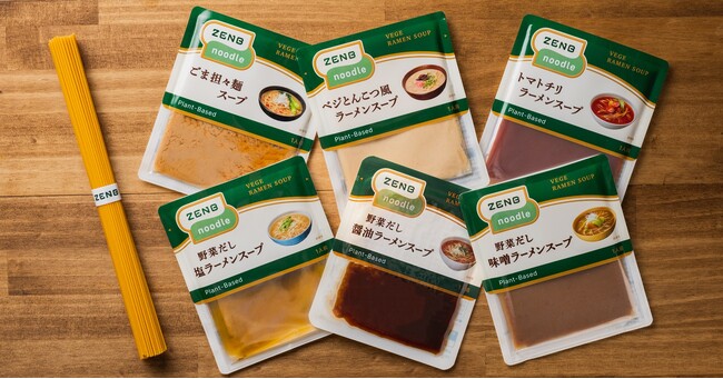 株式会社ZENB JAPAN(ゼンブ ジャパン)(愛知県半田市、以下 ZENB)は、黄えんどう豆100%の新主食「ZENBヌードル」の豆の旨みたっぷりな麺のゆで汁をだしとして活かし、手軽にラーメンを楽しめる専用調味料「ZENBベジラーメンスープ」を2022年12月7日(水)からZENBサイト(https://zenb.jp)で発売。野菜だし醤油、野菜だし塩、ベジとんこつ風、野菜だし味噌、ごま担々、トマトチリの6種の味をお楽しみいただけます。