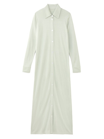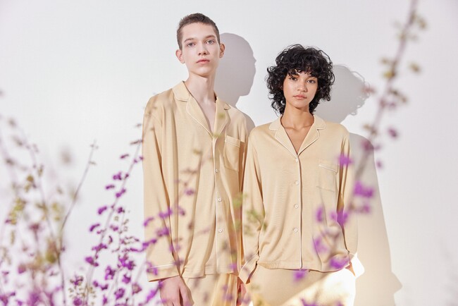 定番のパジャマセットアップに加え、シャツドレスや同素材のシュシュも展開し、カラーはリラックスした素顔の穏やかさや優しさを引き立てるようなやわらかなエッグシェルカラーとミントカラーの2色展開。