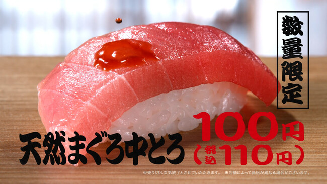 商品詳細:はま寿司が厳選したとろける味わいの「天然まぐろ中とろ」を1皿100円(税込110円)で販売!